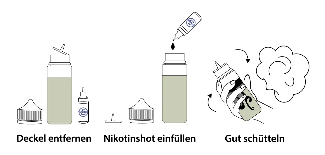 Gib die angegebene Menge Nikotinshots und Base in die Flasche mit dem Konzentrat. Verschliesse die Flasche und schüttle sie kräftig, damit sich alles gut vermischt. Lass das fertige Liquid einige Stunden ruhen, damit sich die Aromen voll entfalten können.